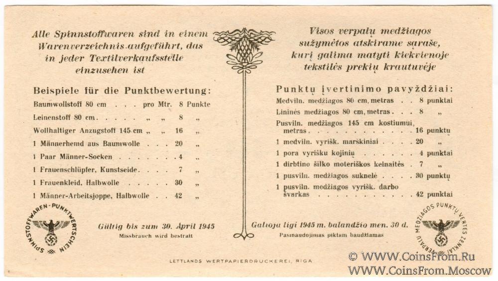 Текстильные талоны. Reichskommissariat OSTLAND. Без номера. LWR (LETTLANDS WERTPAPIERDRUCKEREI, RIGA).