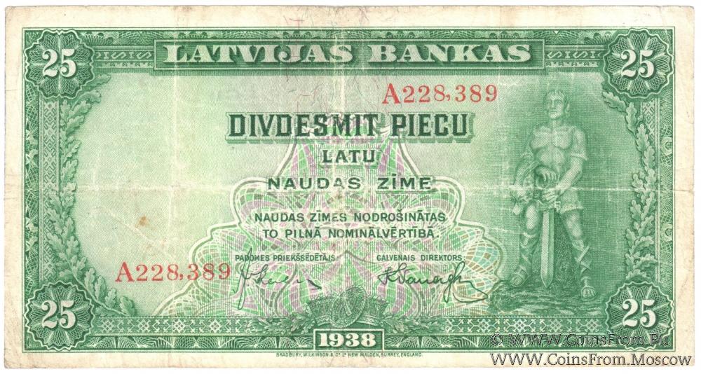 Банковская марка (Bankas naudas zīme) образца 1938 г. Водяной знак - профиль президента Латвии К. Ульманиса.