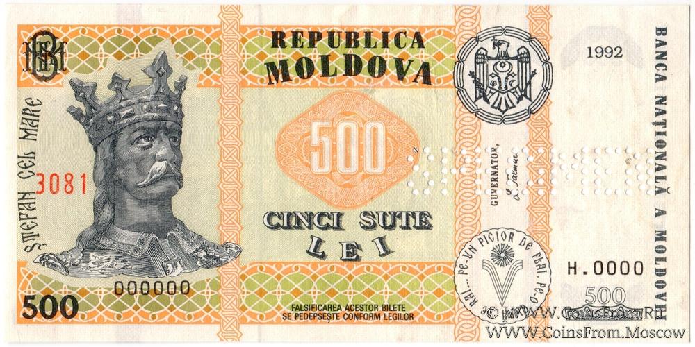 Выпуск 1992 г. в леях. ОБРАЗЕЦ № 3081: горизонтальная перфорация "SPECIMEN". Серия Н. (Выпуск 1999 г.). Эмиссии Национального банка Молдовы (Banca Naţională a Moldovei).