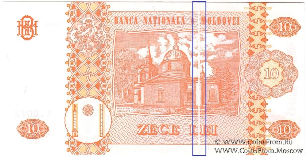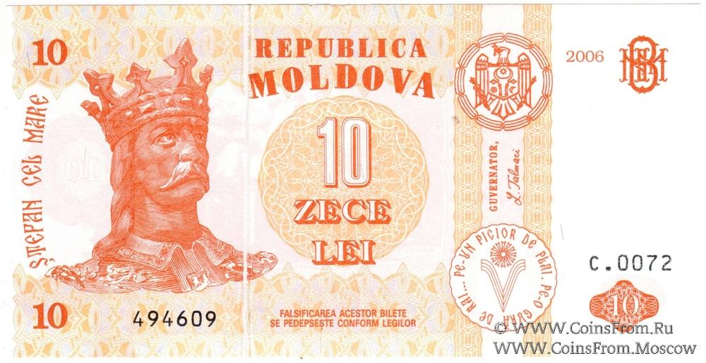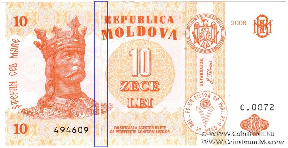 Выпуск 2006 г. в леях. БРАК: замятие листа - "гармошка". Серия С. Эмиссии Национального банка Молдовы (Banca Naţională a Moldovei).