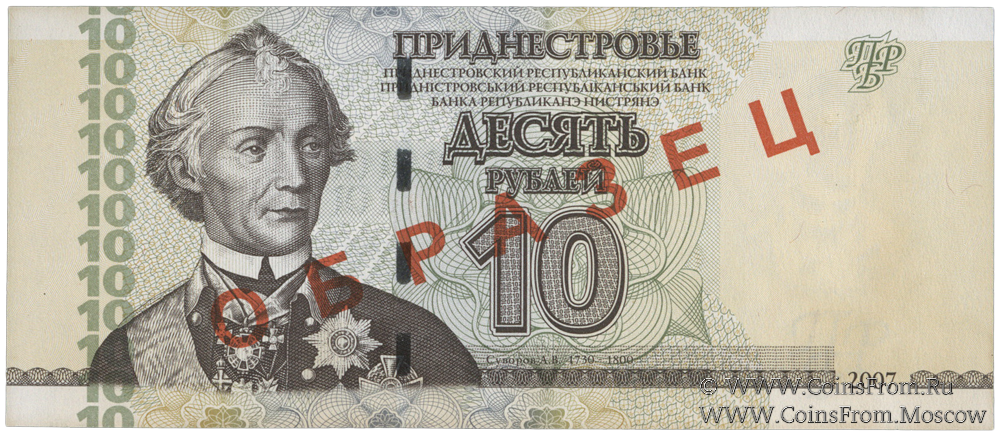 Выпуск 2007 г. Надпечатка красного цвета по диагонали слова "ОБРАЗЕЦ" (на аверсе и реверсе). Приднестровский Республиканский Банк.