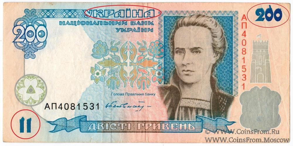 БРАК печати (кляксы синей краски на аверсе). Выпуск 1994-2001 гг. Подпись - Гетьман. Национальный Банк Украины (Національний банк України).