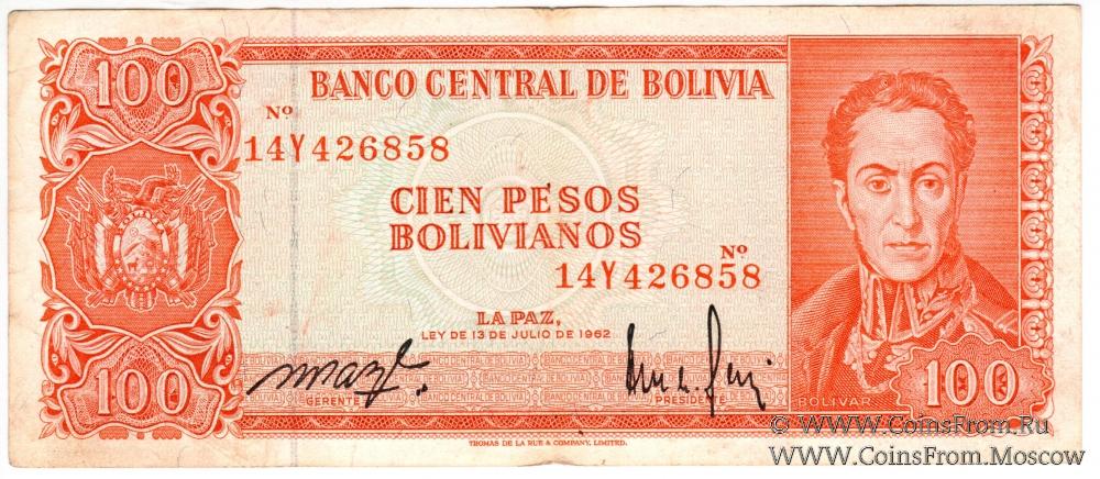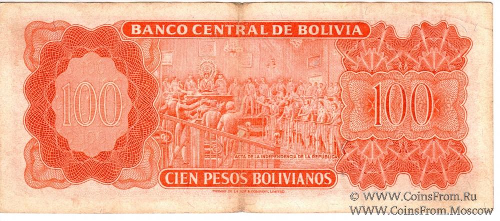 Выпуск 1962 г. Реверс темно-красный. Центральный банк Боливии (BANCO CENTRAL DE BOLIVIA).