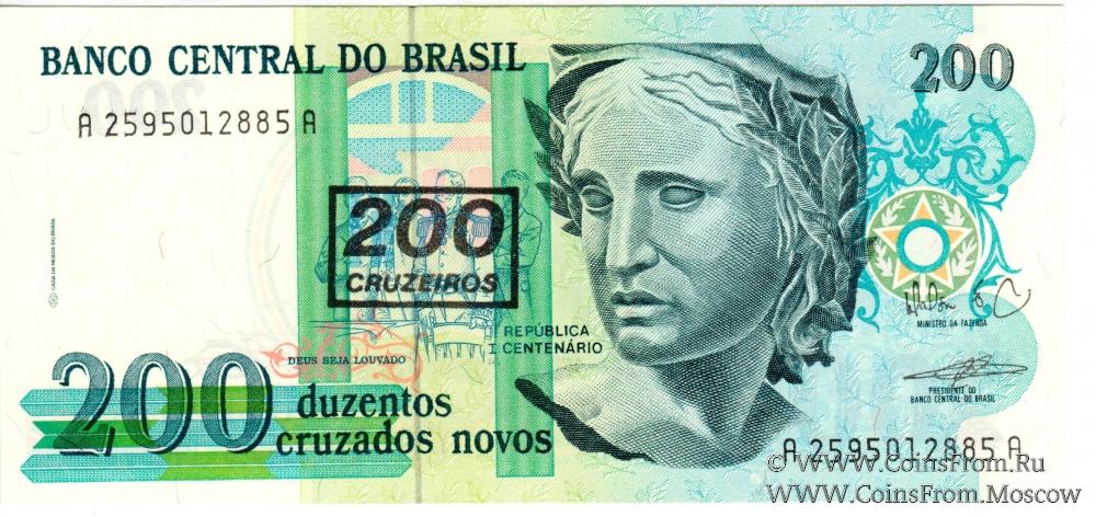 Выпуск 1990 г. (в Крузейро / Cruzeiro). Банкноты предыдущих выпусков с надпечаткой номинала в новой валюте. Серии 1965-2683.