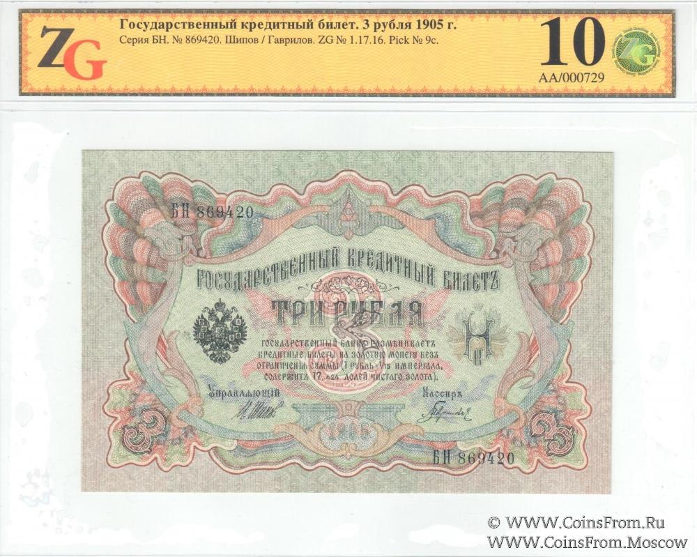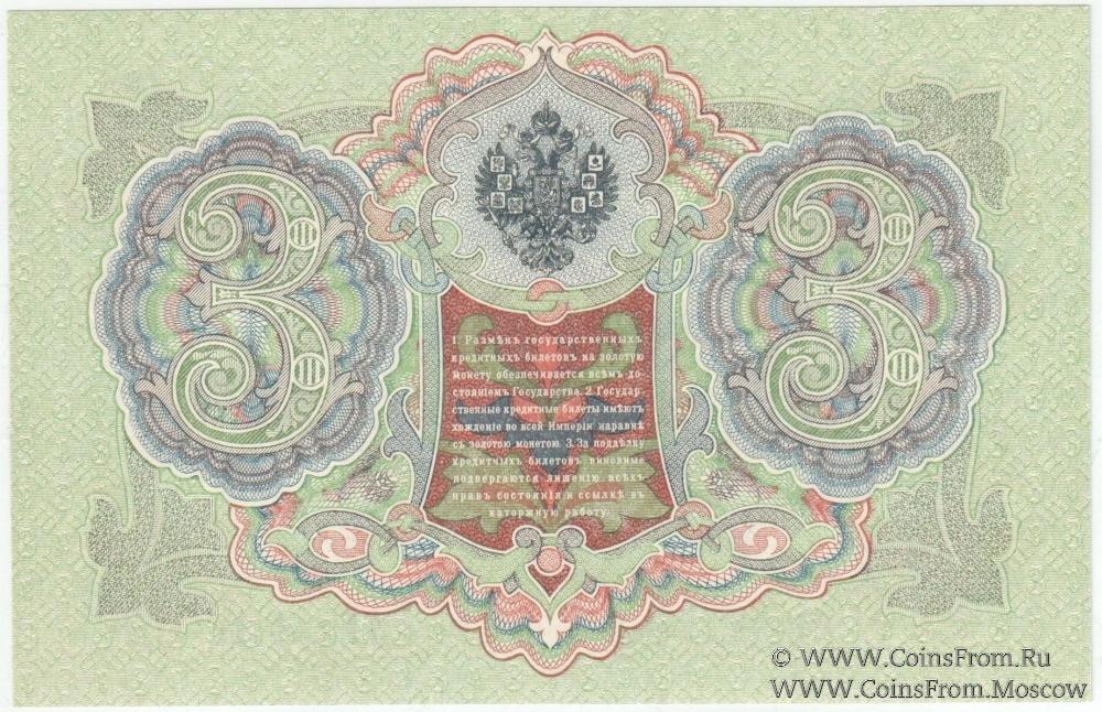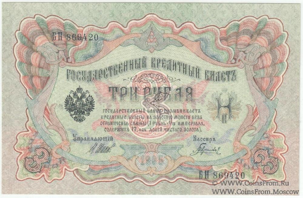 Государственный кредитный билет 3 рубля образца 1905 г. Управляющий - Шипов, кассир - Гаврилов.
