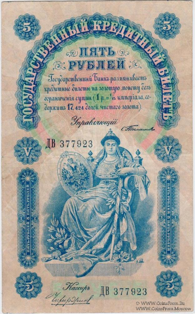 АВЕРС: Центральный элемент билета - женская фигура персонификации России, женщина в княжеской одежде и шапке Мономаха, сидит на троне. В руках у нее щит с гербом Российской империи и меч. Вверху билета по арке из гильошных розеток надпись «Государственный кредитный Билет». В центре билета текст: "ПЯТЬ РУБЛЕЙ Государственный Банк разменивает кредитные билеты на золотую монету без ограничения суммы (1р. = 1/15 империала, содержит 17,424 долей чистого золота.". По сторонам банкноты гильоши с цифрами номинала - "5", в верху и внизу арабскими цифрами по середине римскими цифрами "V", по сторонам России гильоши с текстом "ПЯТЬ РУБЛЕЙ 5 ПЯТЬ РУБЛЕЙ". Подписи Управляющего, Кассира. Серийные номера. Рисунок темно-синего цвета, фоновая многоцветная, преобладающий цвет светло-коричневый.