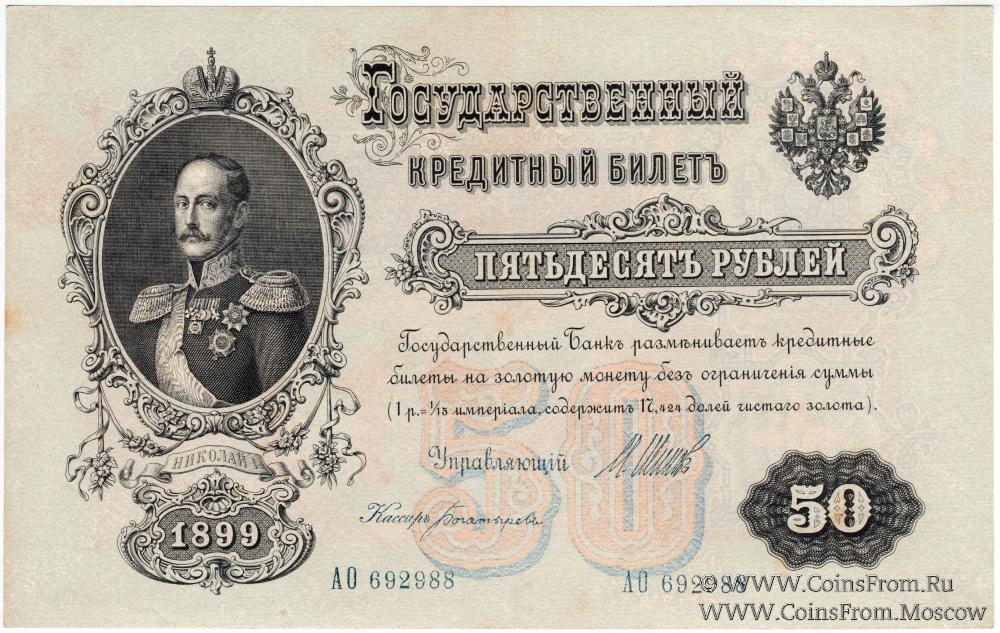 Государственный кредитный билет 50 рублей образца 1899 г. Управляющий И.П. Шипов. Серии АМ - АТ. № АО 692988. Кассир - Богатырев.