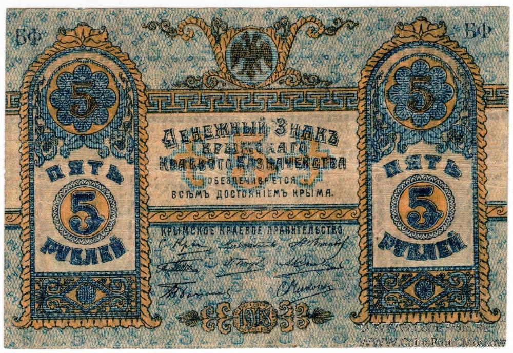 Денежный знак 1918 г. В серии две литеры. Номер на реверсе 3,5 мм. Крымское Краевое Казначейство.