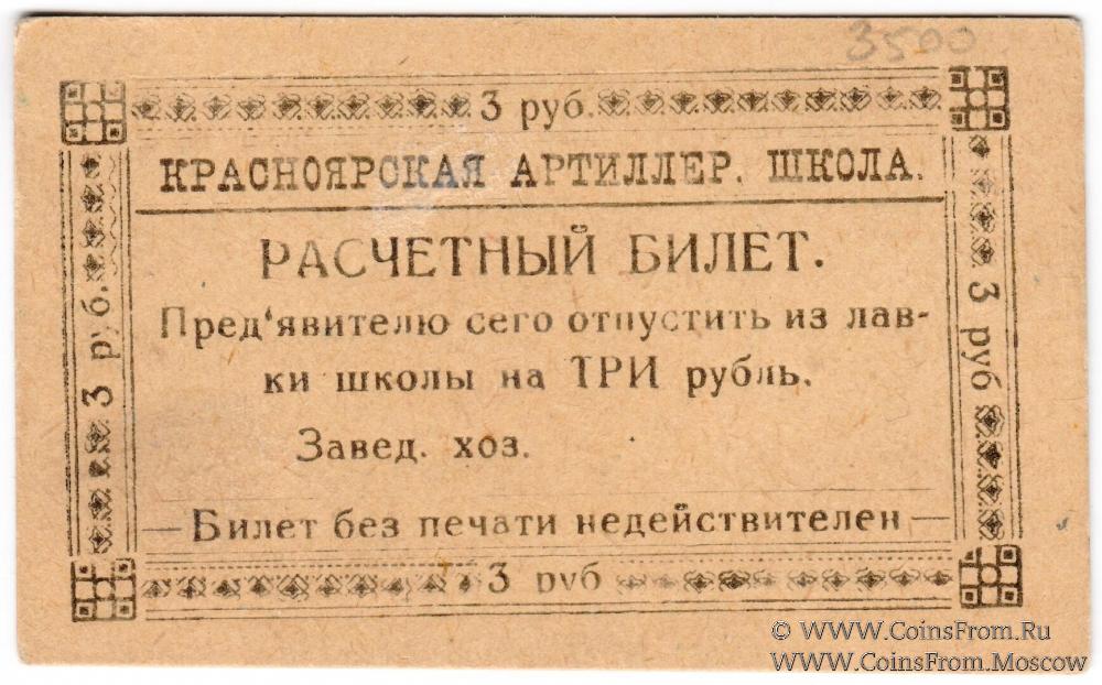 Расчетный билет без даты. Бланк. Красноярская Артиллерийская школа комсостава Р.К.К.А.