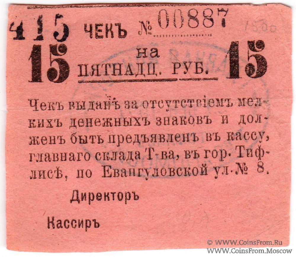 Чек. Аверс: надпечатка "415". Цифры номинала широкие. Реверс: овальная печать главной конторы. Товарищество "Помощь", г. Тифлис.