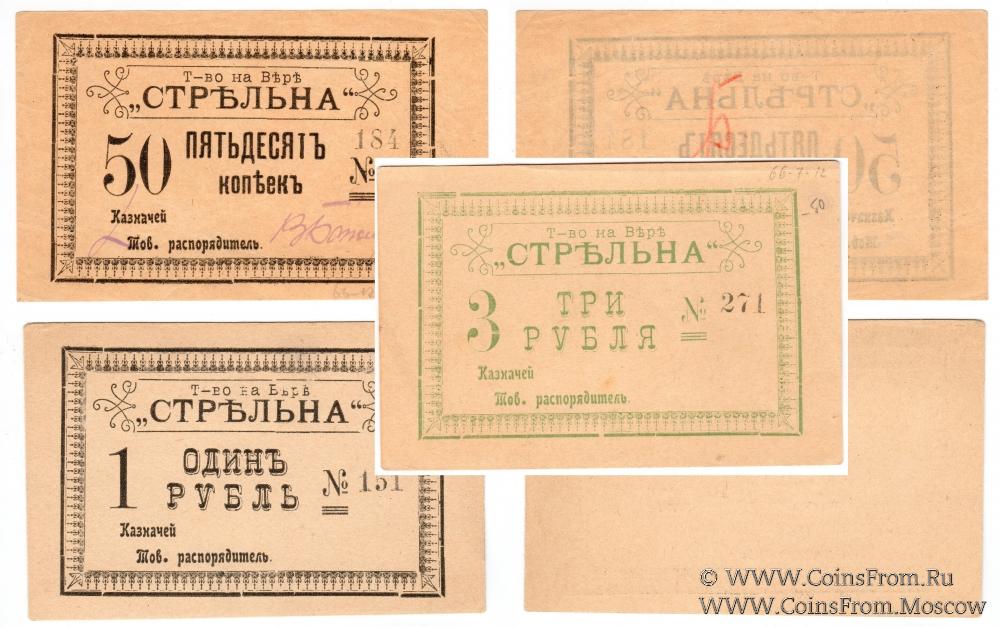 Комплект бон без даты (1919 г.). Сохранность отличная. Товарищество на Вере "Стрельна", Тифлис (Тбилиси).