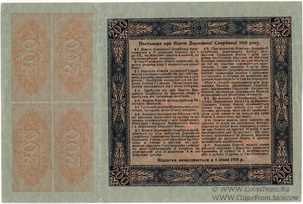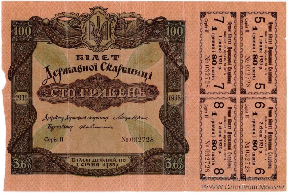 Украинская Держава (Українська Держава). Бiлет Державноi Скарбницi 1918 г. 3,6%. Комплект 1-го выпуска: 50 гривен (серия I, № 147209), 100 гривен (серия II, № 032728), 200 гривен (серия VII, № 159847) и 1000 гривен (серия XVII, № 047370).