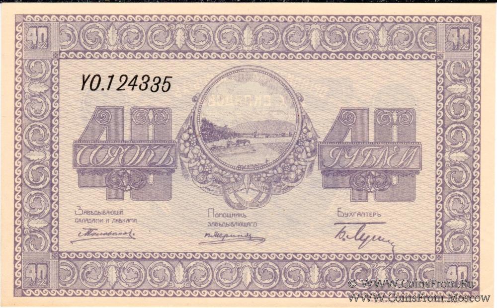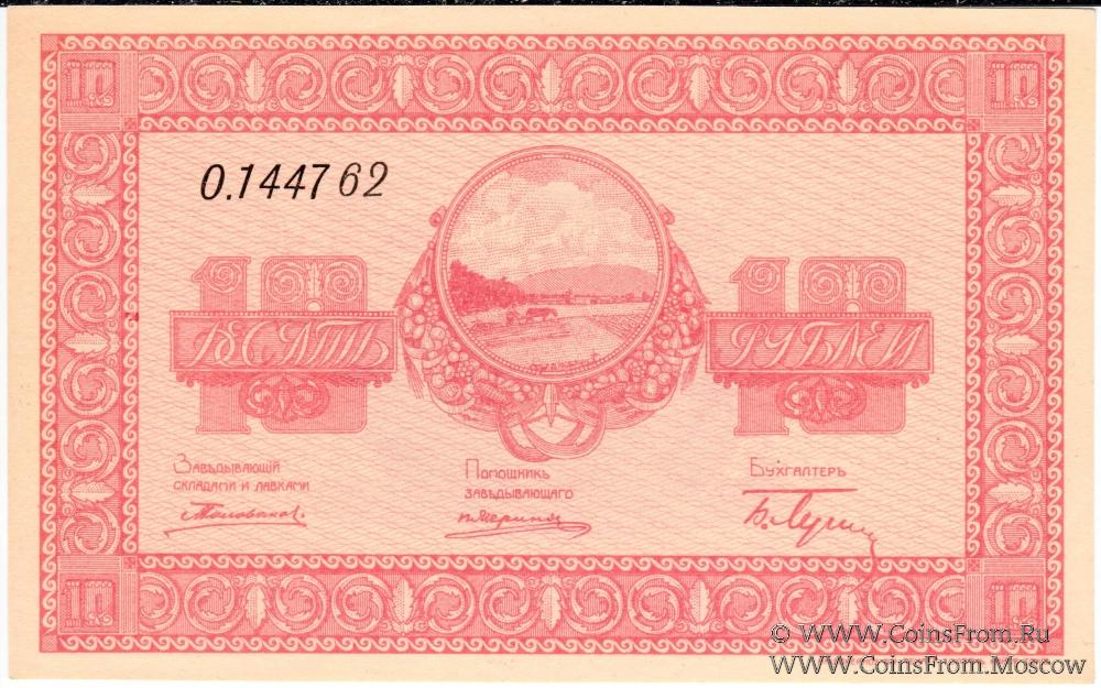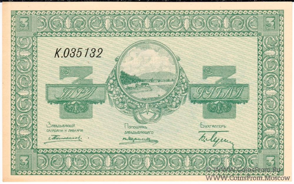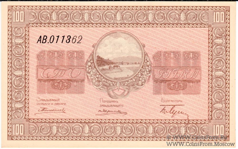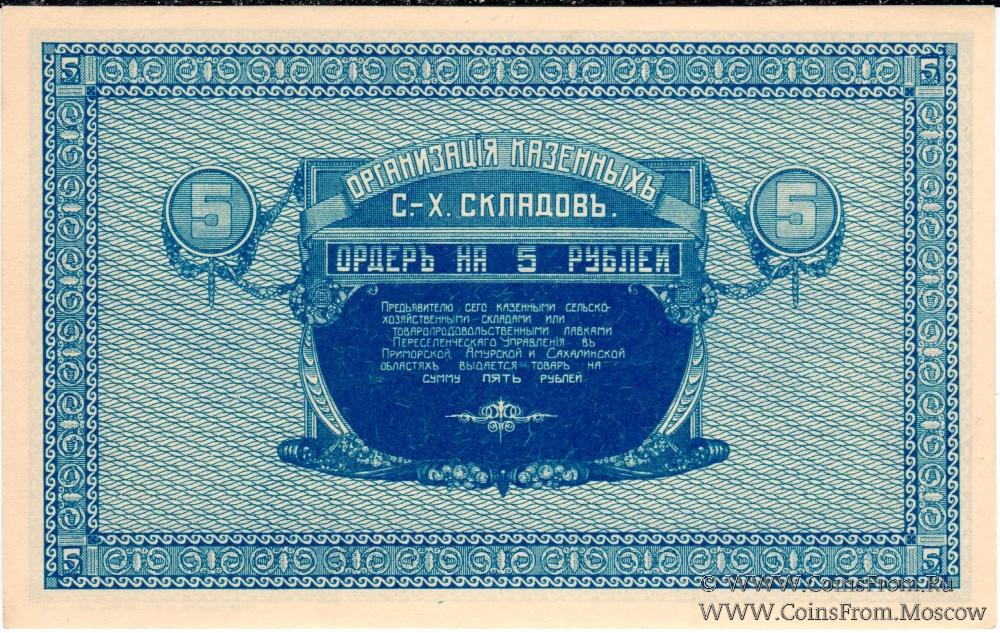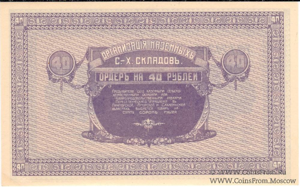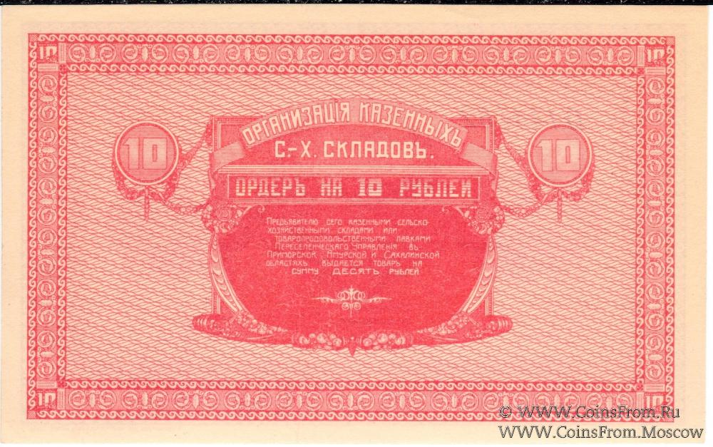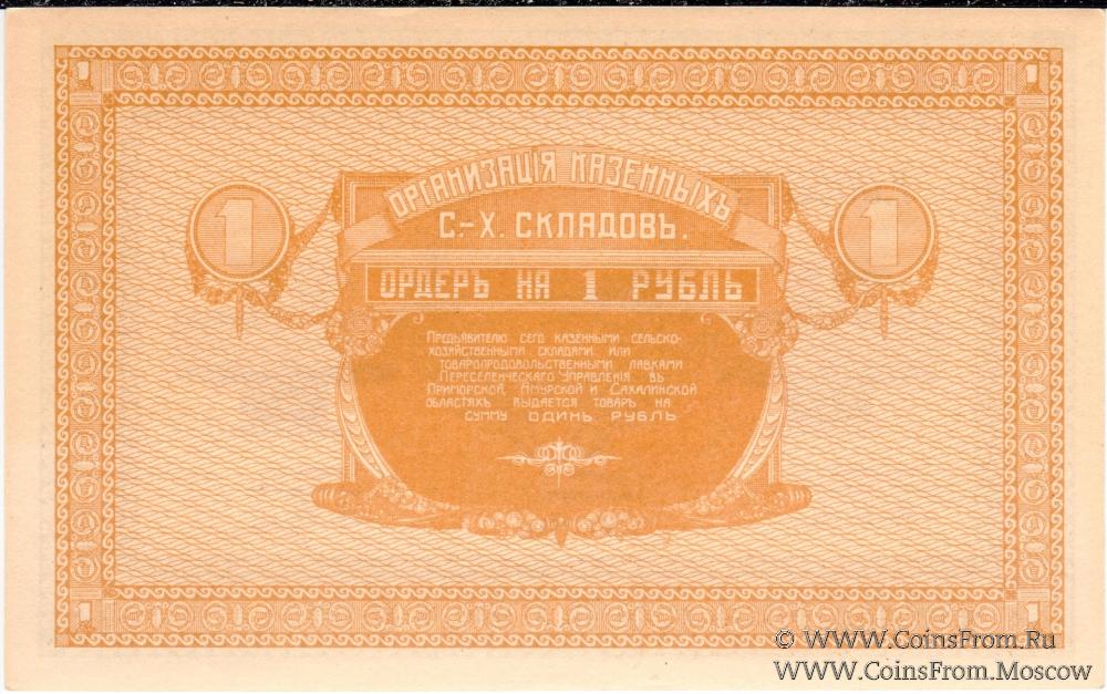 В Никольск-Уссурийске Организация казенных сельскохозяйственных складов выпустила свои ордера достоинством в 1, 3, 5, 10, 20, 40 и 100 руб.. на которых указывалось, что «предъявителю сего казенными сельскохозяйственными складами или товаро-продовольственными лавками переселенческого управления в Приморской, Амурской и Сахалинской областях выдается товар на такую-то сумму».