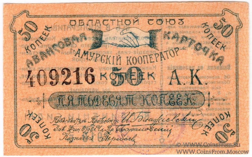 Авансовая карточка 1919 г. Текст на реверсе с выпиской из положения. Областной союз "Амурский кооператор".