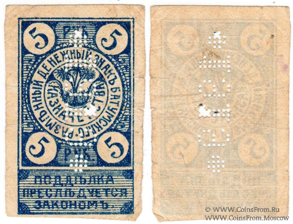 Разменный денежный знак без даты (1919 г.). Синий. Перфорация "*1919*". Батумское Казначейство.