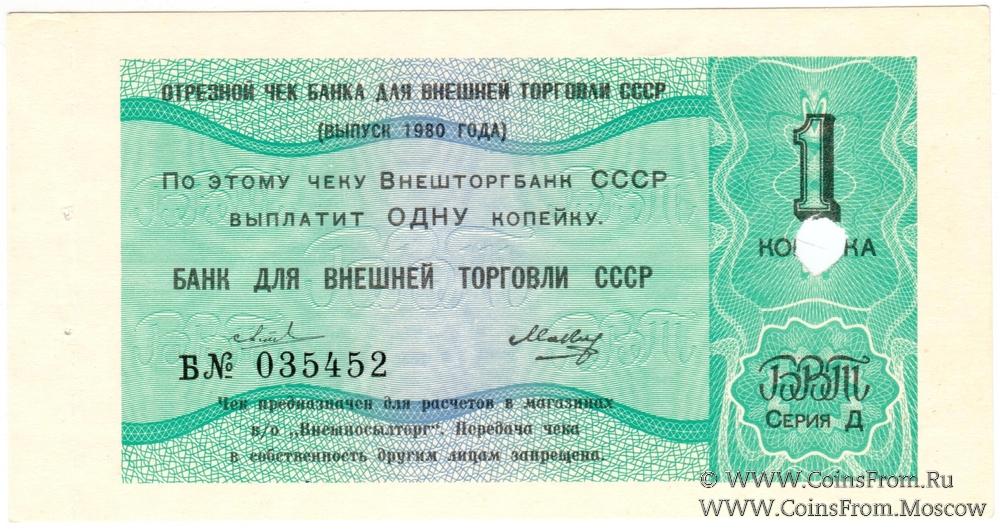 Отрезной чек 1 копейка 1980 г. Серия Д.
