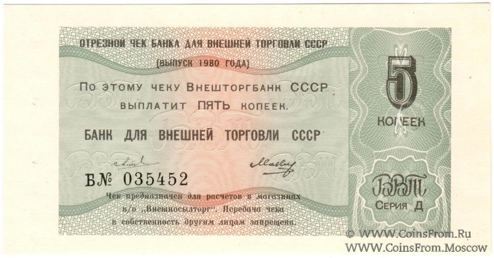 Отрезной чек 5 копеек 1980 г. Серия Д.