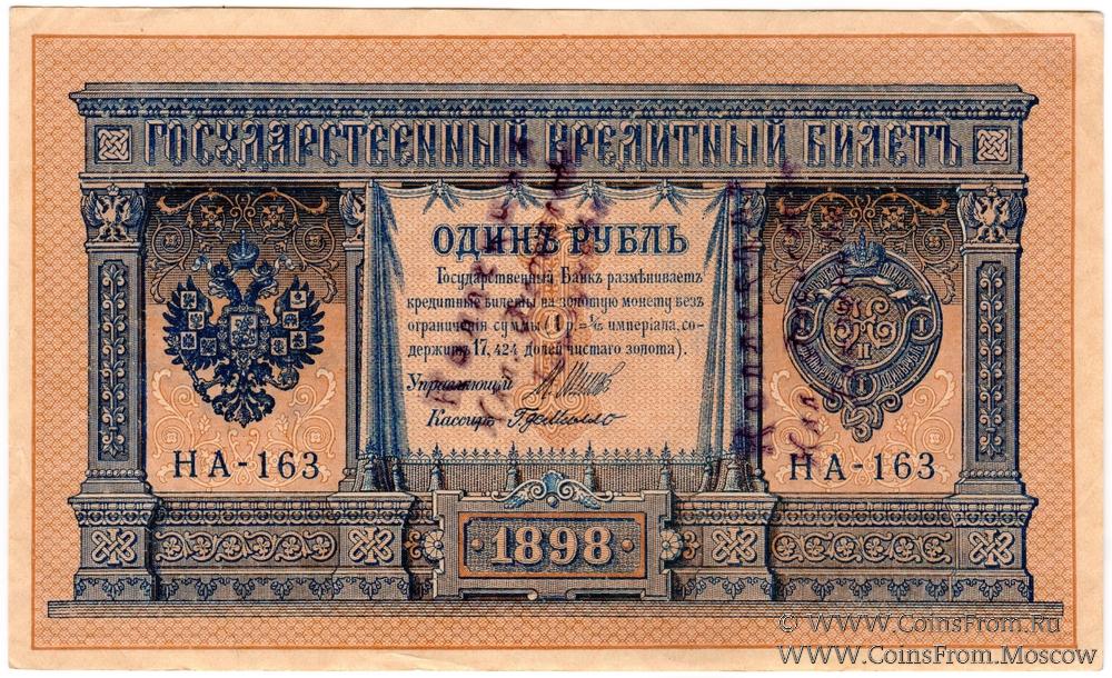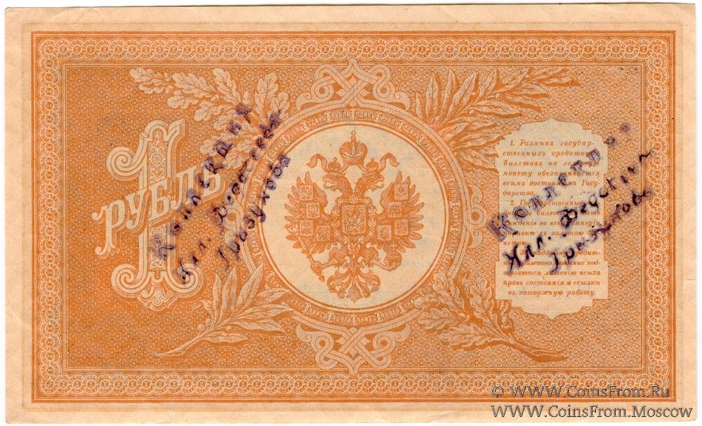 Государственный кредитный билет 1 рубль образца 1898 г. Модификация 1915 (с упрощенной нумерацией). Надпечатка "Коллекция Илл. Федосеева Грызунова". Управляющий - Шипов, кассир - Где Милло. Государственный Банк.