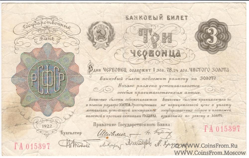 Банковые билеты Государственного Банка РСФСР выпущены на основании декрета СНК от 11 октября 1922 г. 1 червонец = 1 золотнику 78,24 долей чистого золота. Билеты образца 1922 года оставались в обращении до денежной реформы 1947 года.