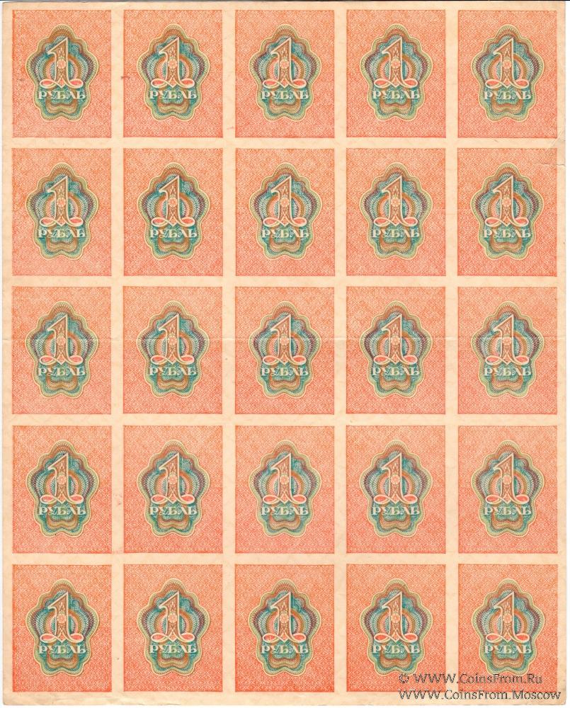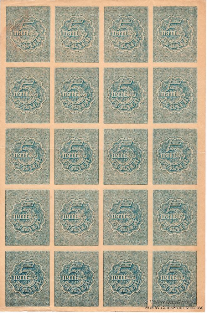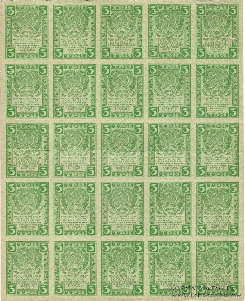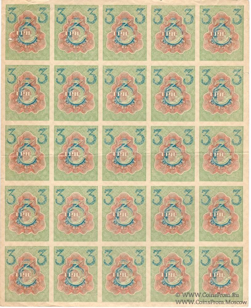 Полные листы: 1 рубль (1-й выпуск 1919 г.; 5х5), 3 рубля (1-й выпуск 1919 г.; 5х5) и 5 рублей (образца 1920 г.; 5х4).