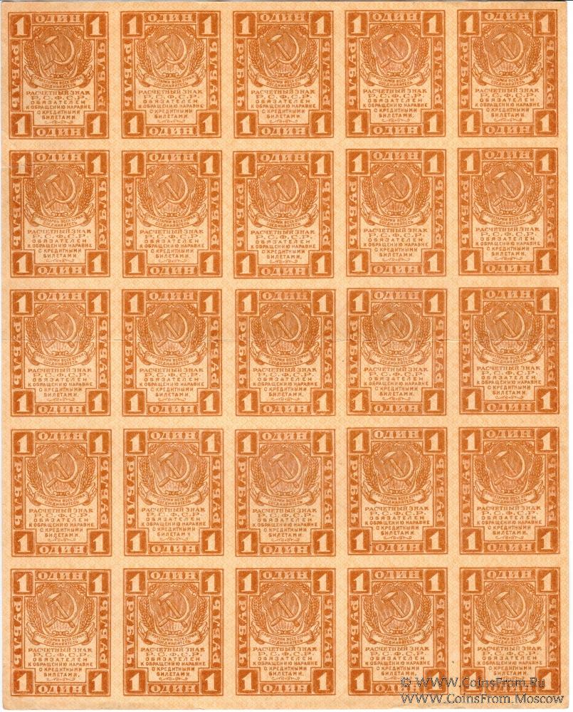 Расчетные знаки 1, 2 и 3-рублевого достоинства упрощенного типа выпущены на основании декрета СНК РСФСР от 4 февраля 1919 г., поступали в обращение наравне с кредитными билетами. Печатались листами по 25 штук в листе (5х5). В обращении до 1922 г.
