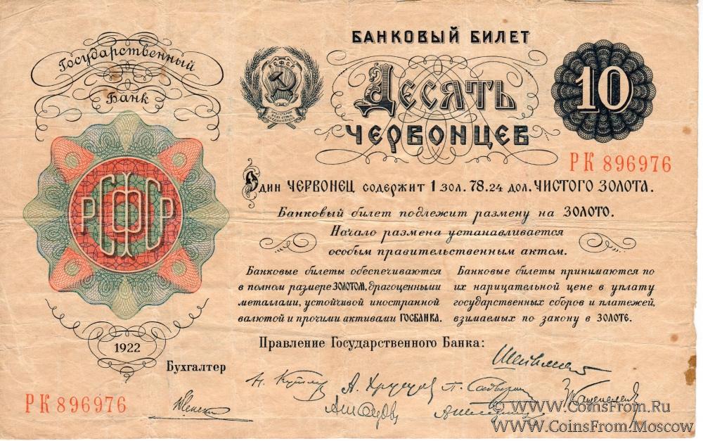 Банковые билеты Государственного Банка РСФСР выпущены на основании декрета СНК от 11 октября 1922 г. 1 червонец = 1 золотнику 78,24 долей чистого золота. Билеты образца 1922 года оставались в обращении до денежной реформы 1947 года. Фактически заменены в денежном обращении банкнотами образца 1924, 1926, 1928, 1932 и 1937 гг.