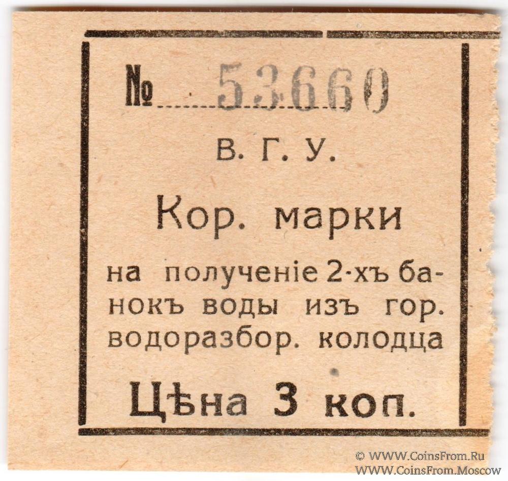 Кор.марки (на получение 2-х банок воды из городского водоразборного колодца). Владивостокская Городская Управа (В.Г.У.).