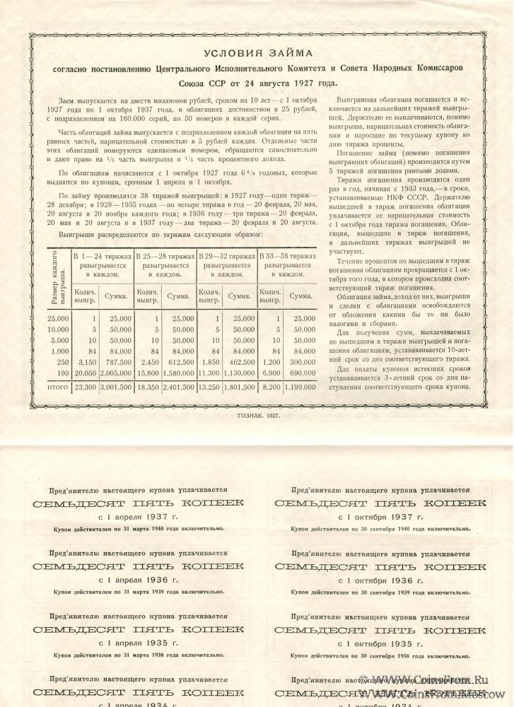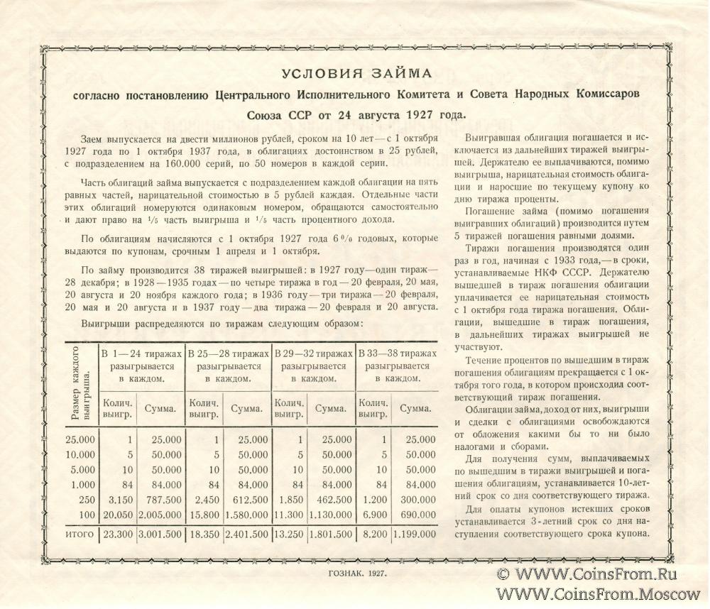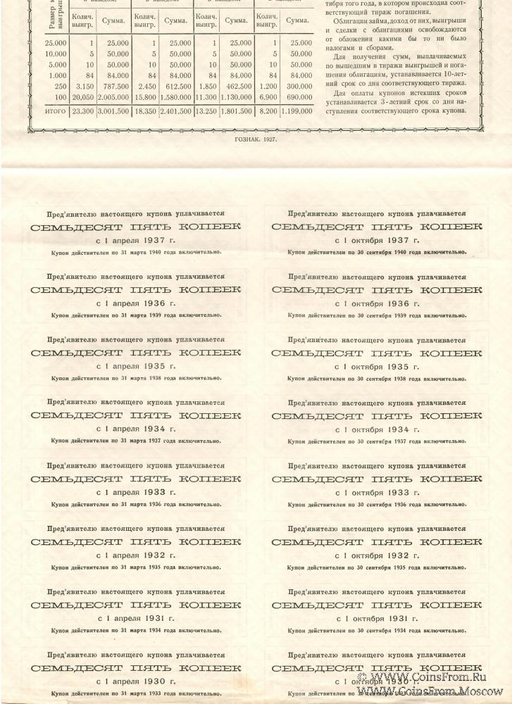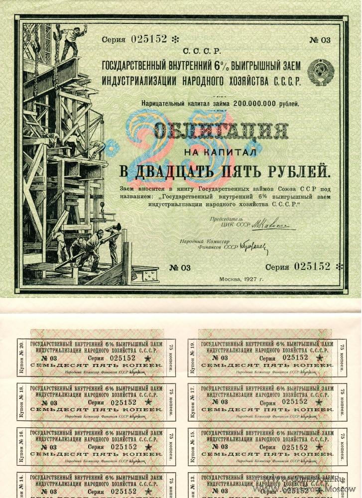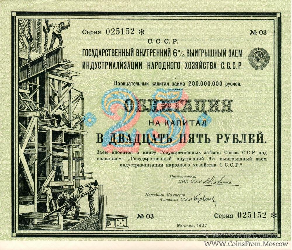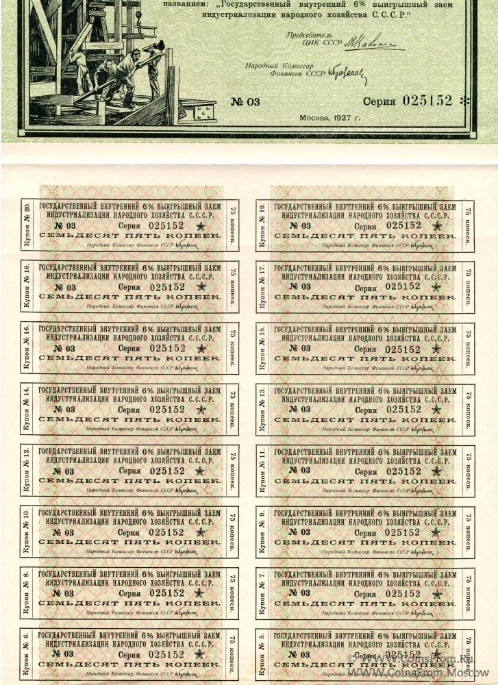 Государственный внутренний 6% выигрышный заем индустриализации народного хозяйства С.С.С.Р. 1927 года.
