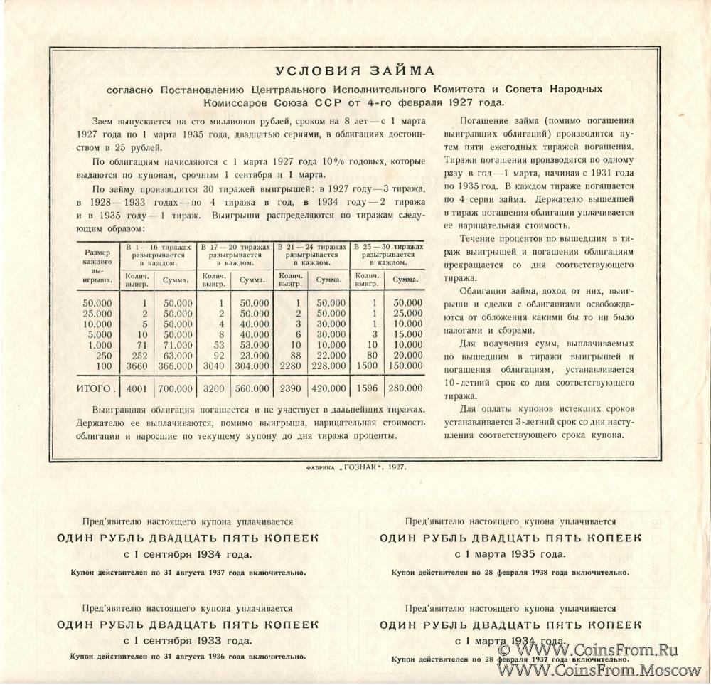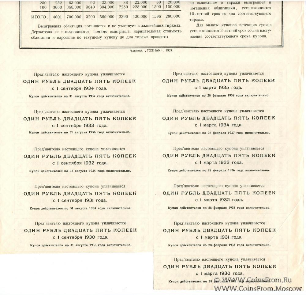 Процентно-выигрышный выпуск. Срок 8 лет (01.03.1927 - 01.03.1935). Серий - 20. Купонов - 16.