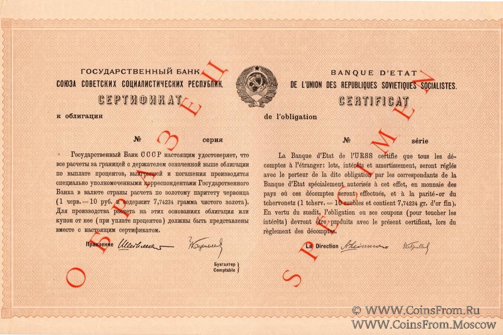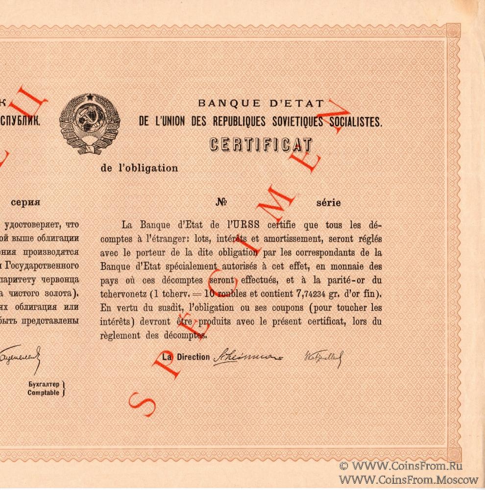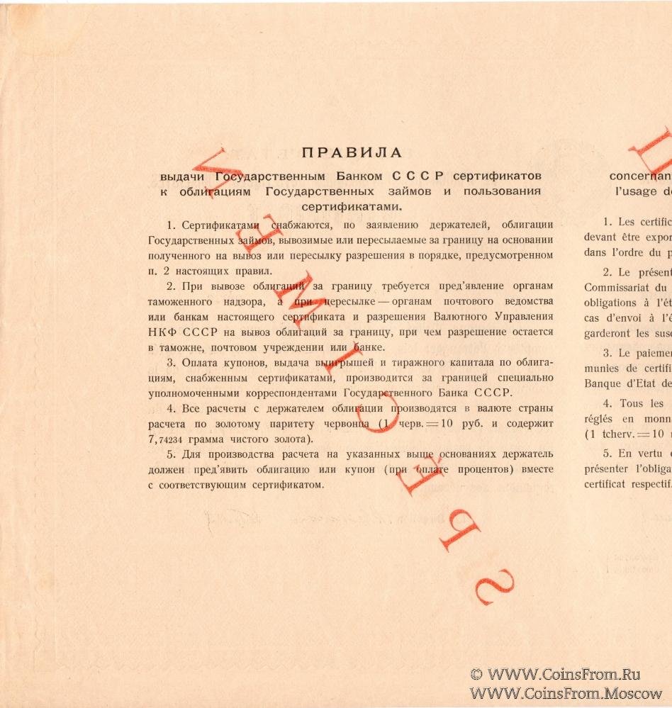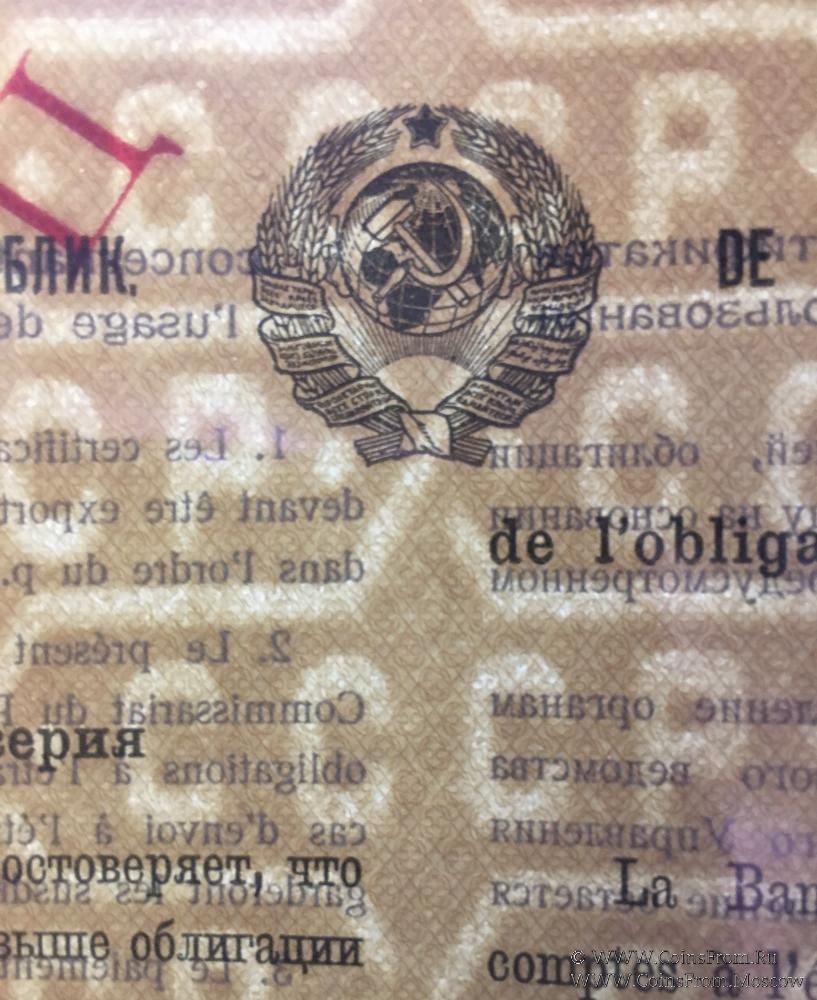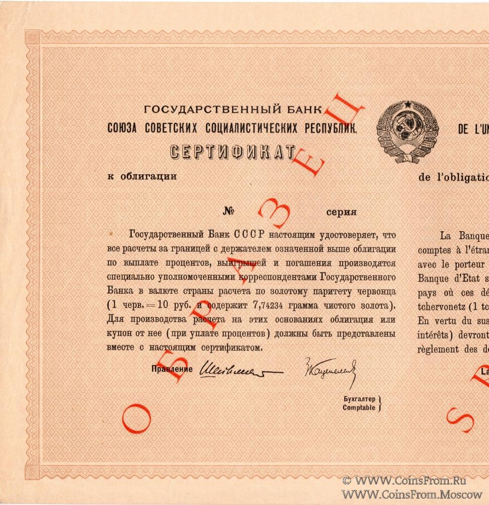 Сертификат (Гознак 1927 г.) Государственного Банка СССР к облигации Второго Госуд. Внутреннего Выигрышного Займа Индустриализации Народного Хозяйства СССР.