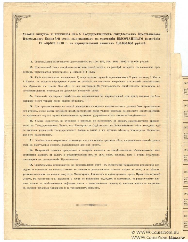 Государственное 4.5% свидетельство на 100 рублей. Крестьянского поземельного банка. 1913 г. 4 серия. Исторический документ (финансовой ценности не имеет), может использоваться не только как коллекционный материал, но и как предмет декора. Отпечатан в 1913 году. Возраст более 100 лет.