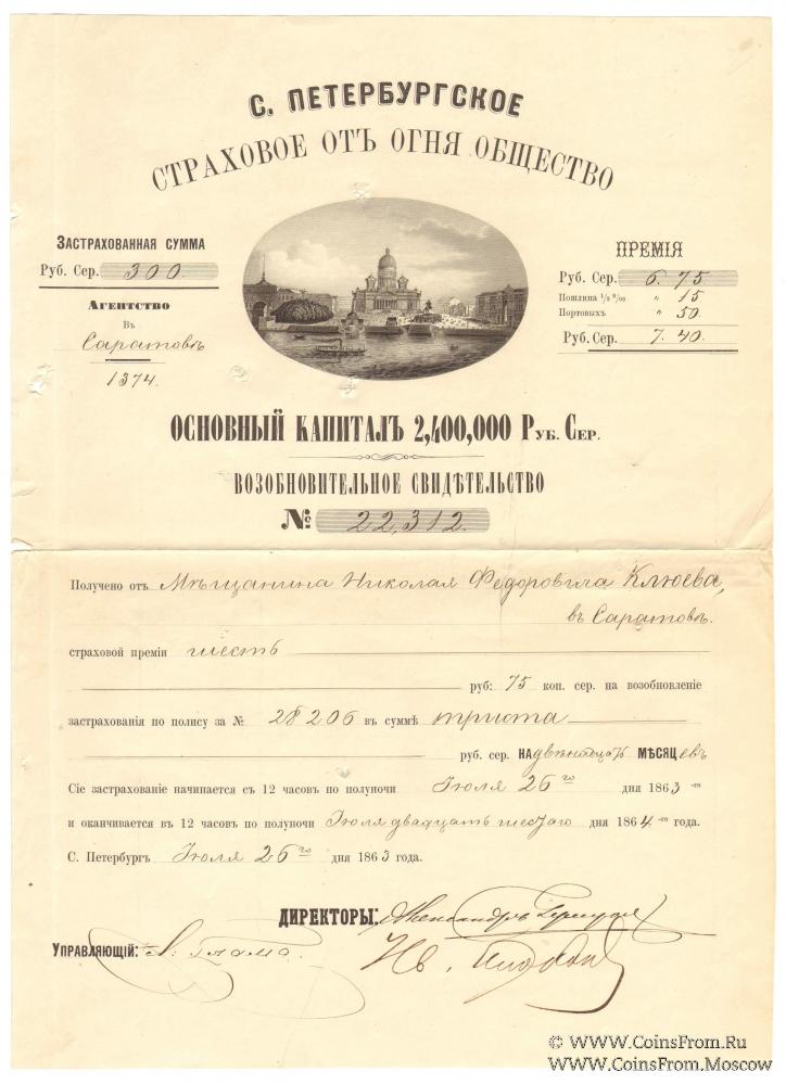 Возобновительное свидетельство С.Петербургского Страхового от огня общества 1863 года