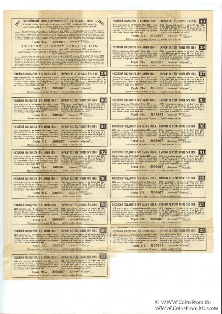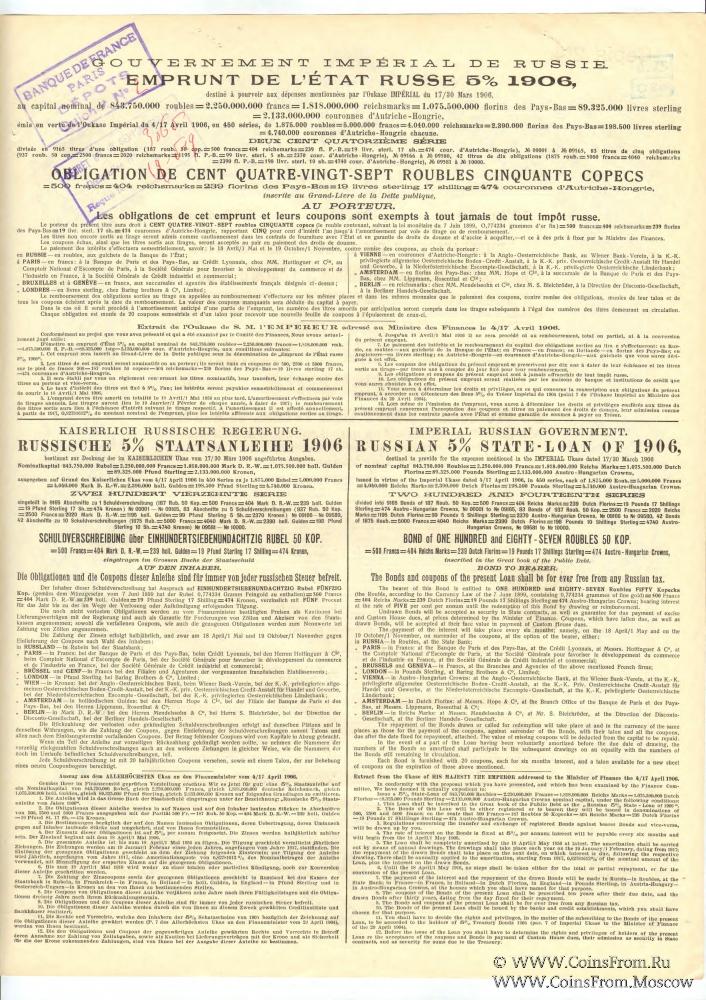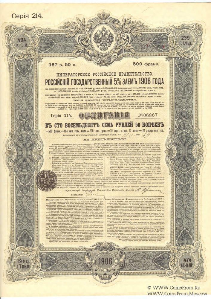 Российский государственный 5% заём 1906 года – внешний заём Российский империи, облигации которого освобождались от всех видов русских налогов. Облигации выпускались с купонным листом. По облигациям - именным или на предъявителя - предусматривалось 2 купона в год.