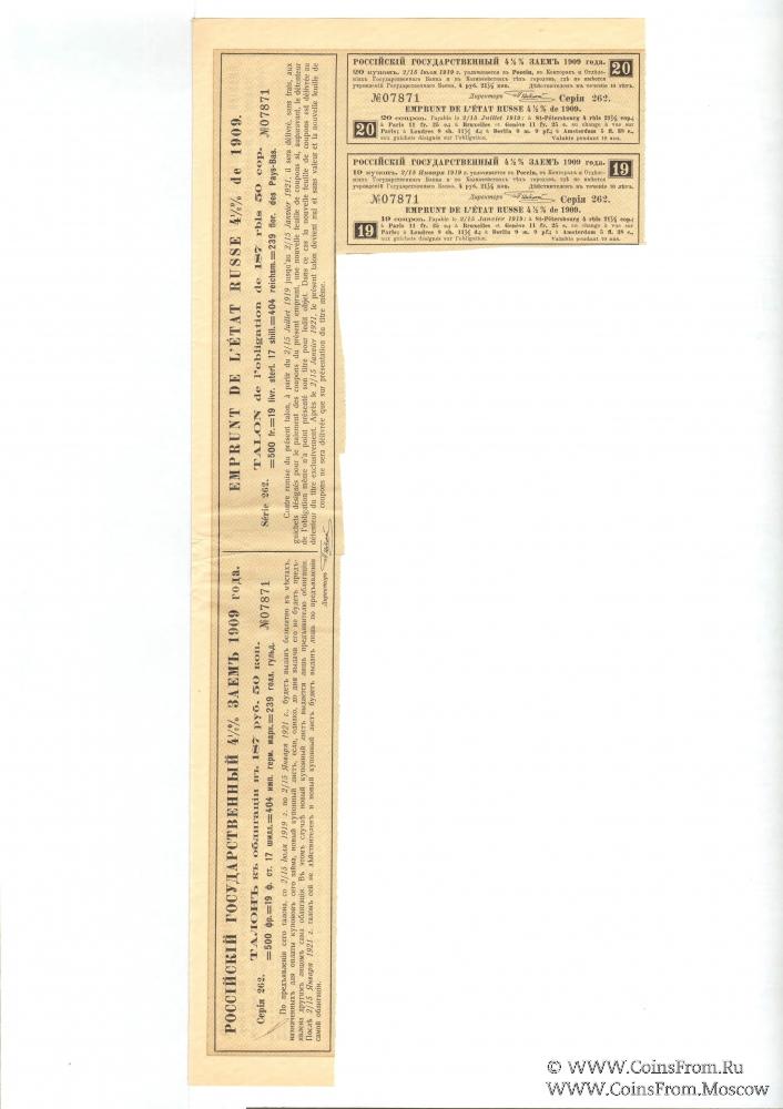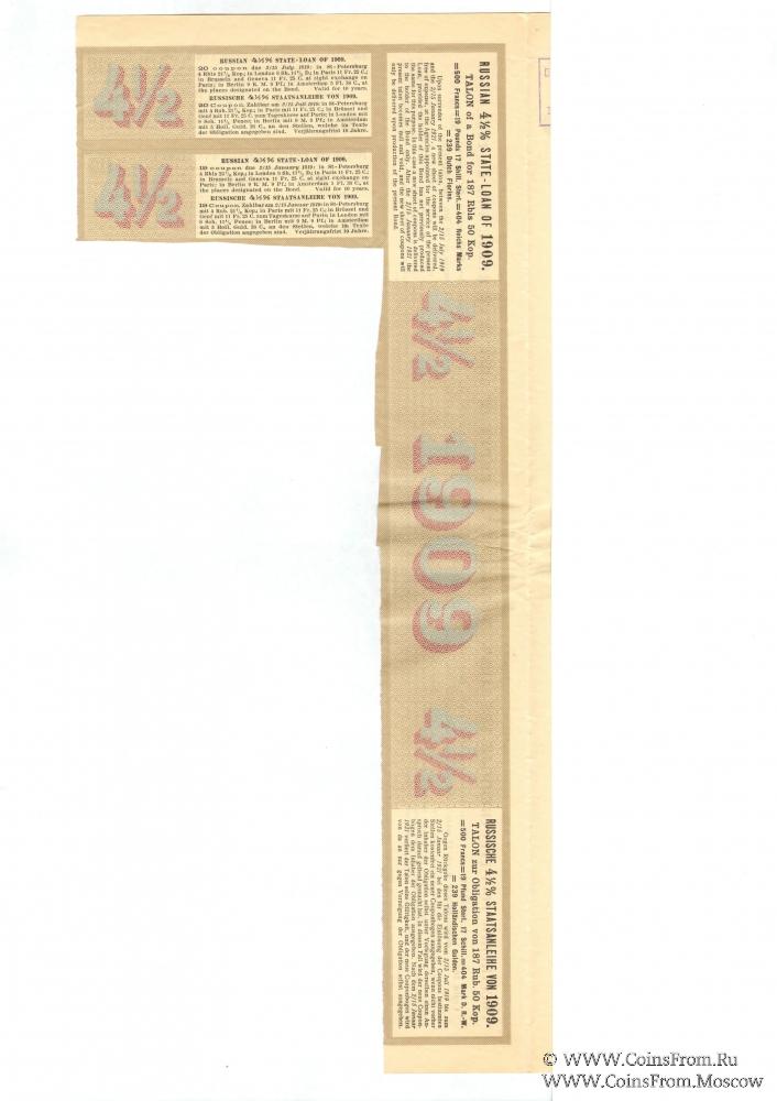 Российский государственный 4,5% заём 1909 года – внешний заём Российский империи, облигации которого освобождались от всех видов русских налогов. Облигации выпускались с купонным листом на 10 лет (20 купонов). По облигациям - именным или на предъявителя - предусматривалось 2 купона в год — со 2 января и с 1 июля, проценты начислялись со 2 января 1909 года. До 2 января 1919 года не предусматривалось выкупа или конверсии облигаций займа. Заем аннулирован с 1 декабря 1917 года декретом от 21 января 1918 года.