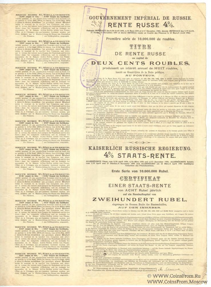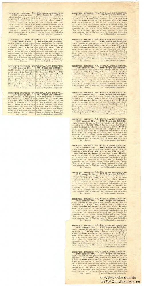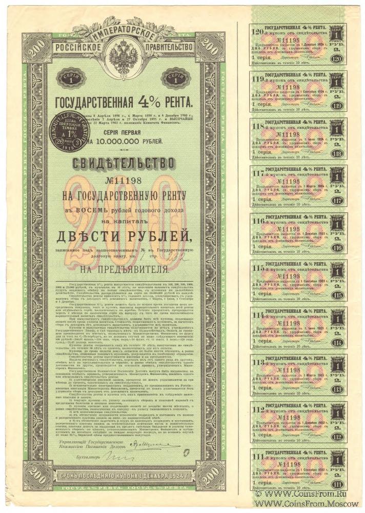 Указом от 6 марта 1898 года12 было разрешено принимать купоны от свидетельств ренты и вышедшие в тираж свидетельства в уплату таможенных пошлин, считая 1 рубль в этих купонах и свидетельствах равным 1/15 империала, и производить оплату купонов и тиражных свидетельств за границей. Курс оплаты составлял: 100 рублей = 266,67 франкам = 216 имперским германским маркам = 10 фунтам стерлингов 11 шиллингам 5 пенсам = 128 голландским гульденам.В 1913-1914 годах был произведен генеральный обмен всех выпущенных свидетельств Государственной 4 % ренты серий 1-270 на свидетельства нового типа (узкий лист) со сроком последнего купона 1 декабря 1924 года. Таким образом, фактически была произведена унификация свидетельств Государственной 4 % ренты.