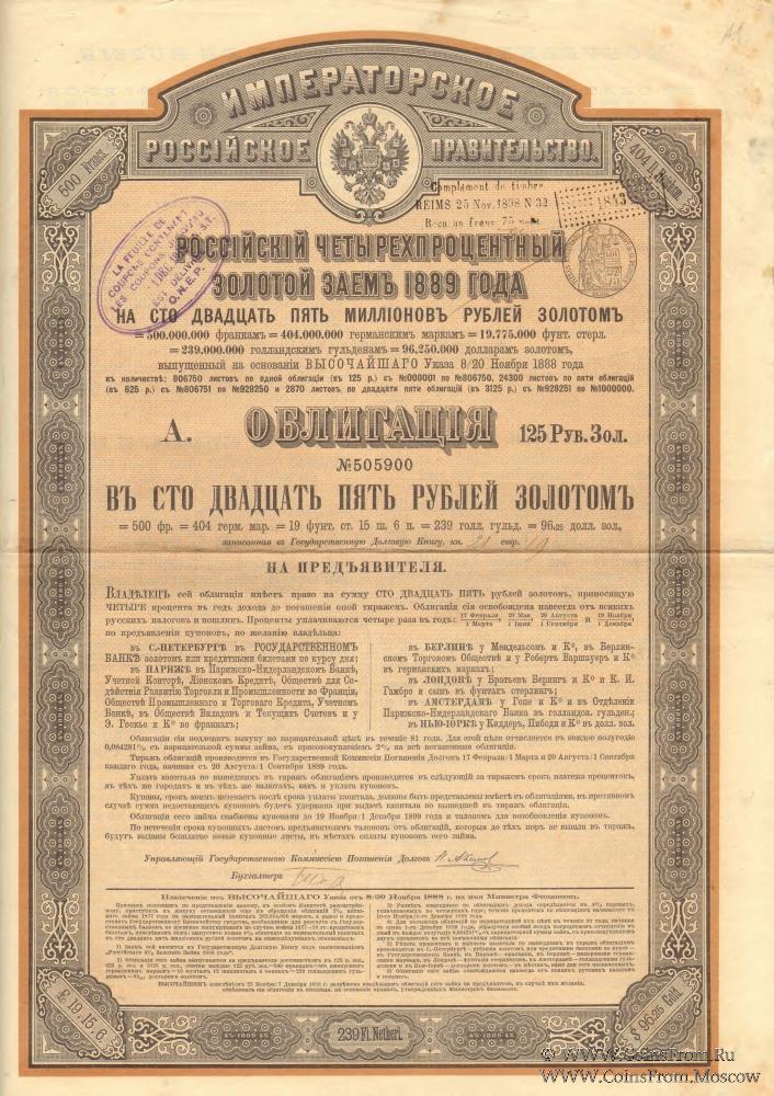 В 1889-1896 гг. Российское правительство выпустило Российский 4% золотой заем на сумму 332,0 млн. золотых рублей. Заем был совершен путем первого(1889 г.), второго (1890 г.), третьего (1890 г.), четвертого (1890 г.), пятого (1893 г.) и шестого (1894 г.) выпусков. Кроме того, правительство выпустило Российские 31/2 % и 3 % золотые займы 1894 г. и 1891 – 1896 гг. Облигации имели необычные номиналы: 125, 625, 3125 рублей золотом, 187 рублей 50 копеек и 937 рублей 50 копеек. Это было сделано для удобства перевода в европейские валюты по фиксированному курсу, прежде всего французского рынка, так как Франция являлась главным кредитором России.