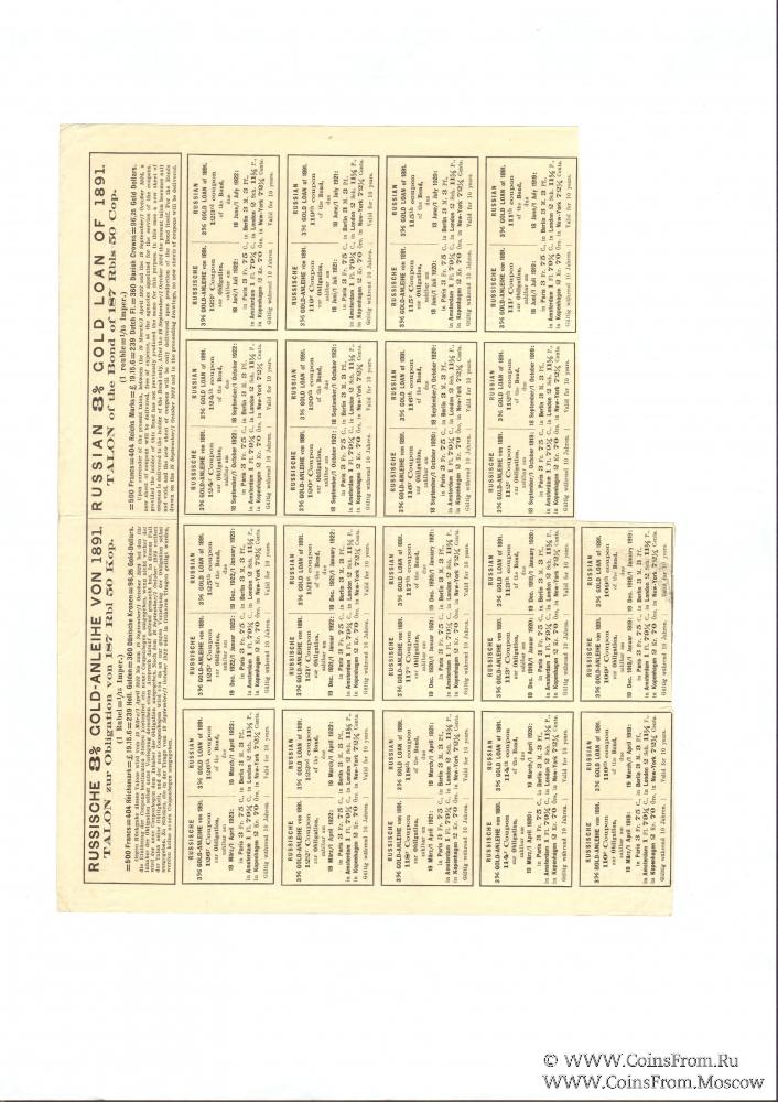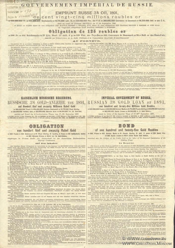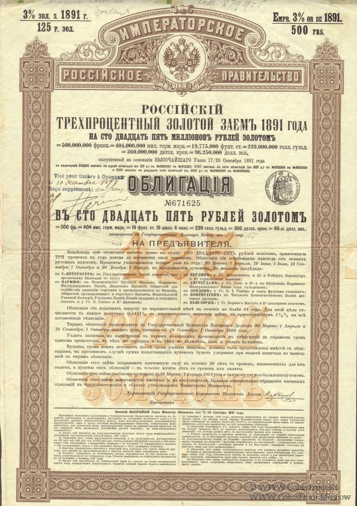 Заем был заключен согласно указу от 17 сентября 1891 года (№ 7980) через посредство синдиката иностранных и русских банкиров на сумму 125 миллионов рублей золотом. Средства, полученные от займа, использовались на железнодорожное строительство. Погашение займа предусматривалось в течение 81 года. Облигации выпускались с 1891 года с купонным листом на 10 лет (40 купонов). По облигациям предусматривалось четыре купона в год — с 19 марта, с 18 июня, с 19 сентября и с 19 декабря. Течение процентов, начиная с 19 сентября 1891 года. Облигации займа выпускались как именные, так и на предъявителя. В связи с завершением денежной реформы Витте 1895-1898 годов 1 рубль золотом по закону от 17 декабря 1885 года (=1/10 империала) стал приравниваться 1,5 рублям (1 рубль=1/15 империала) согласно закону от 7 июня 1899 года. Облигация в 125 рублей золотом стала стоить 187 рублей 50 копеек, облигация в 625 рублей стала стоить 937 рублей 50 копеек и облигация в 3 125 рублей золотом стала стоить 4 687 рублей 50 копеек. Заем был аннулирован с 1 декабря 1917 года декретом от 21 января 1918 года.