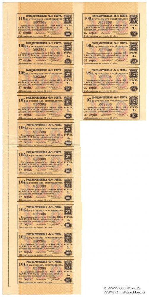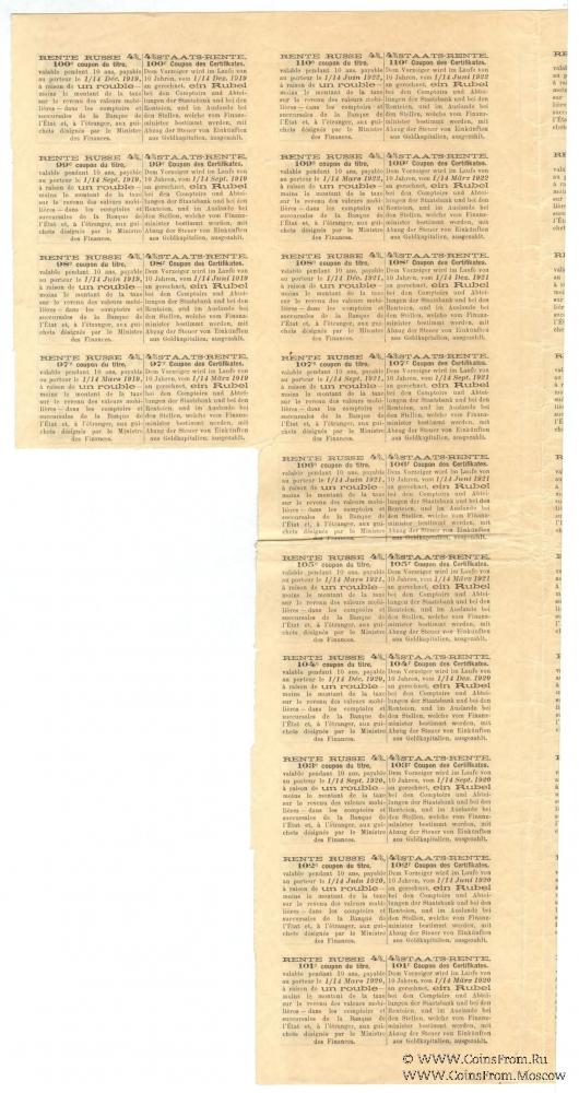 Указом от 6 марта 1898 года12 было разрешено принимать купоны от свидетельств рен­ты и вышедшие в тираж свидетельства в уплату таможенных пошлин, считая 1 рубль в этих купонах и свидетельствах равным 1/15 империала, и производить оплату купонов и тиражных свидетельств за границей. Курс оплаты составлял: 100 рублей = 266,67 франкам = 216 имперским германским маркам = 10 фунтам стерлингов 11 шиллингам 5 пенсам = 128 голландским гульденам.В 1913-1914 годах был произведен генеральный обмен всех выпущенных свидетельств Государственной 4 % ренты серий 1-270 на свидетельства нового типа (узкий лист) со сроком последнего купона 1 декабря 1924 года. Таким образом, фактически была произведена унификация свидетельств Государственной 4 % ренты.