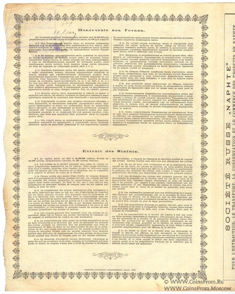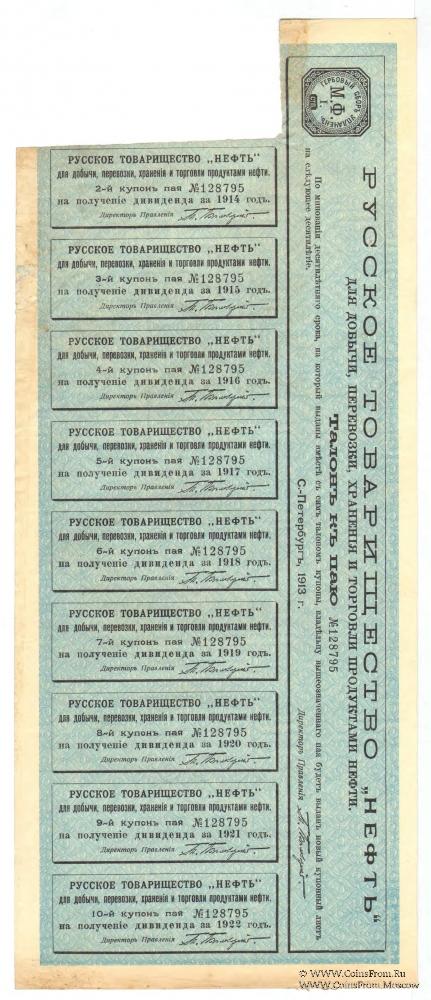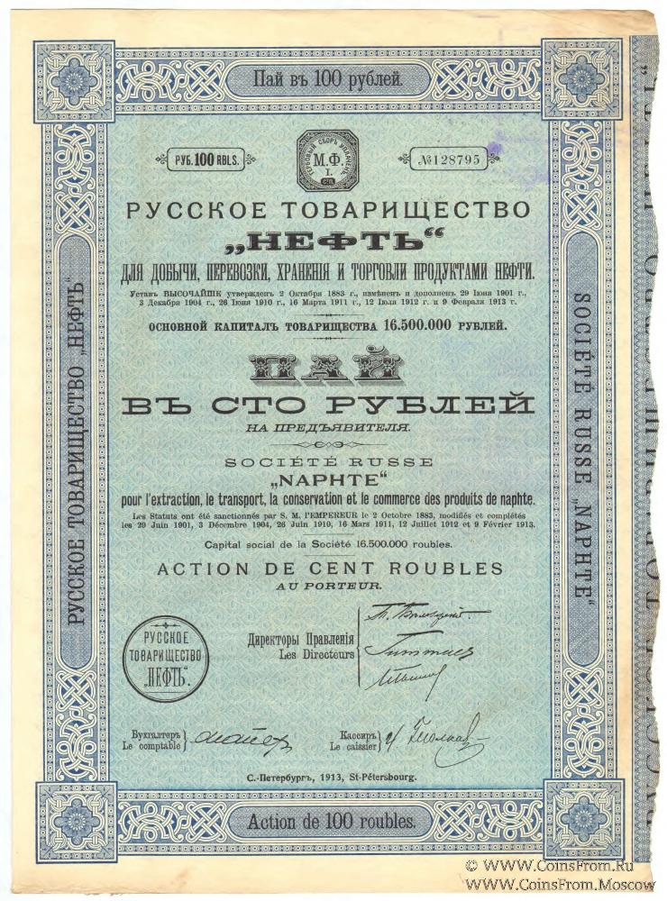 В 1883 году через четыре года после основания "Бранобель", было учреждено Русское товарищество " Нефть ", у истоков создания которого стоял известный российский предприниматель и нефтепромышленник Петр Иванович Губонин (1828-1892). Вместе с В.А.Кокоревым он создал Волжско-Камский коммерческий банк, был владельцем нескольких НПЗ и оказал заметное влияние на развитие нефтяного дела России. Как следует из его титула на 100 рублевом пае на предъ-явителя, это товарищество было организовано "для добычи, перевозки, хранения и торговли продуктами нефти " и по сути являлось первой или, по крайней мере, одной из первых русских нефтяных фирм с внутренней вертикальной структурой - прообразом нынешних ЛУКОЙЛа, ЮКОСа и др.
