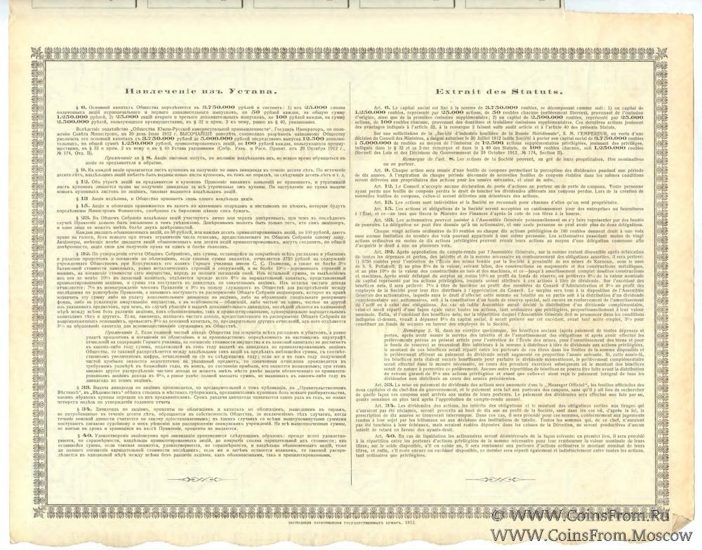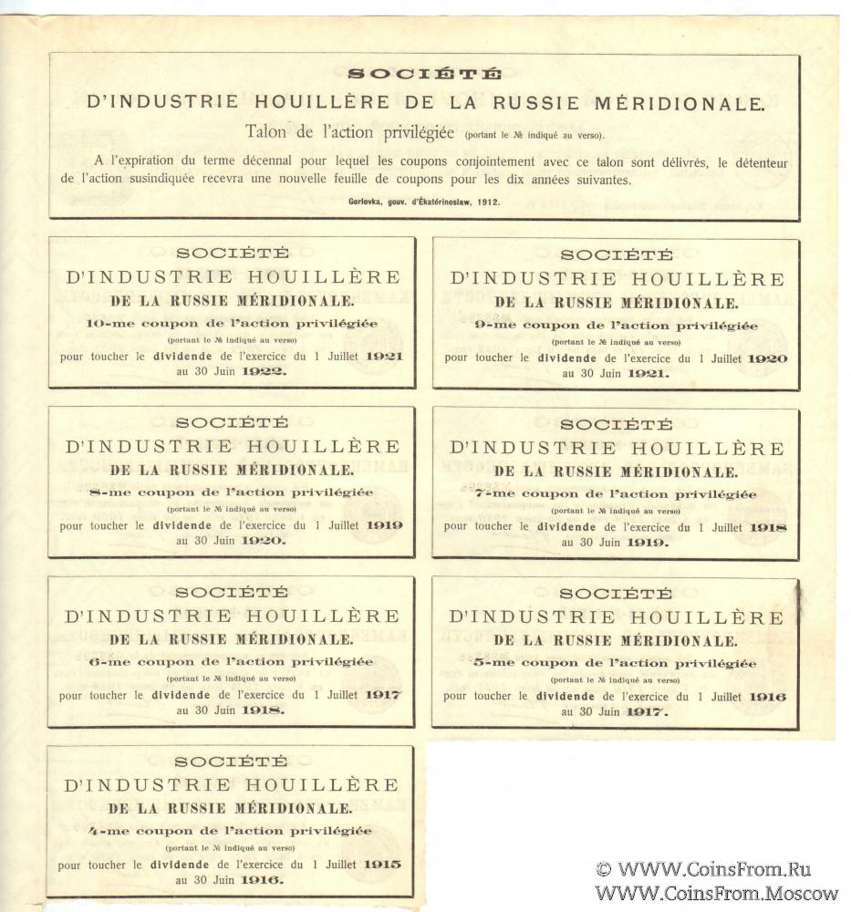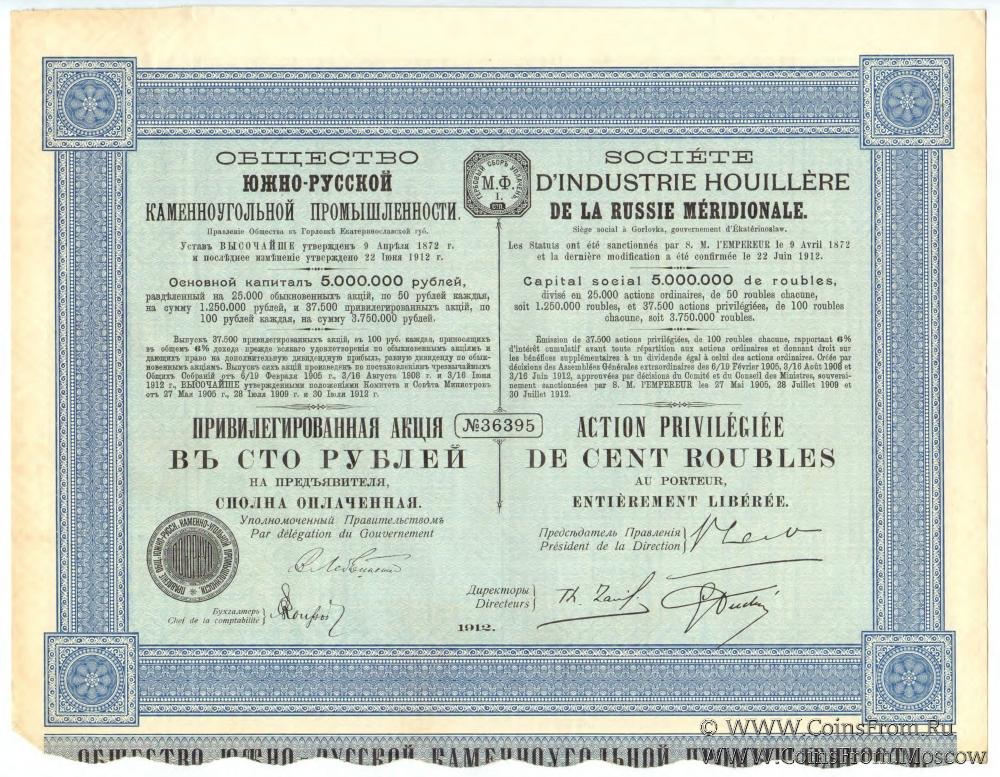 Привилегированная акция в сто рублей общества Южно-Русской каменноугольной промышленности. Акция на двух языках - русском и французском, на бумаге с водяными знаками (плетенка). Факсимиле подписей председателя правления Общества, директоров, уполномоченного правительством и бухгалтера. Талон и 7 купонов. Подлинная старинная ценная бумага 1912 года печати. Исторический документ (финансовой ценности не имеет), может использоваться не только как коллекционный материал, но и как предмет декора. Возраст более 100 лет.