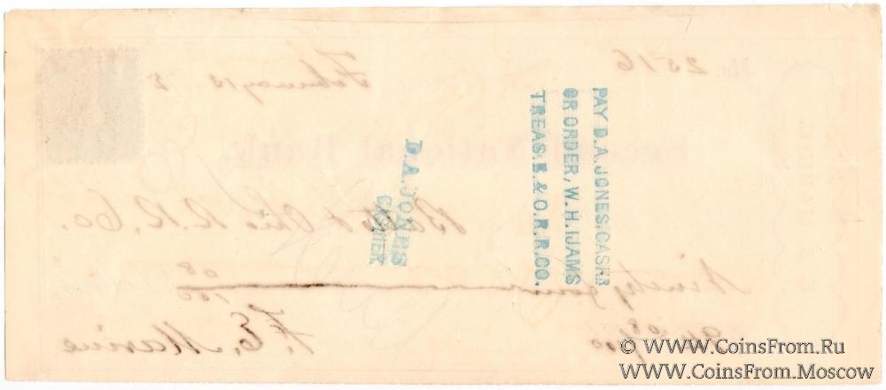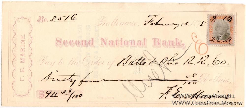 Банковский чек (оплачен). Второй национальный банк (Sekond National Bank). Baltimore.