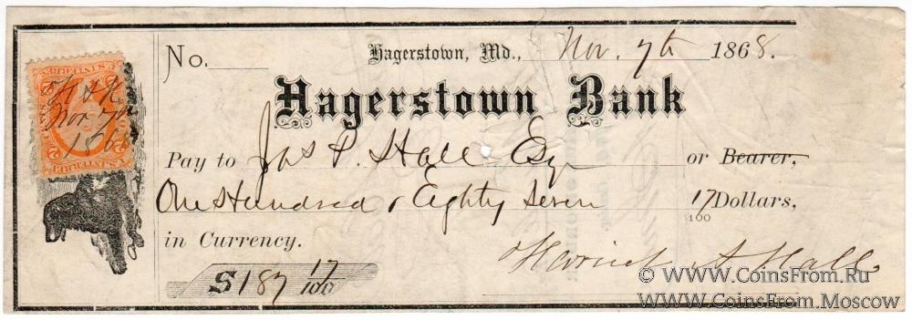 Банковский чек (погашен, оплачен). Перфорация. Штампы. Подписи. Хейгерстаун Банк (Hagerstown Bank).