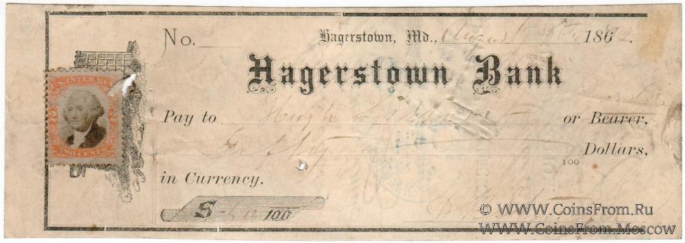 Банковский чек (погашен, оплачен). Перфорация. Штампы. Подписи. Хейгерстаун Банк (Hagerstown Bank).