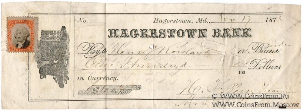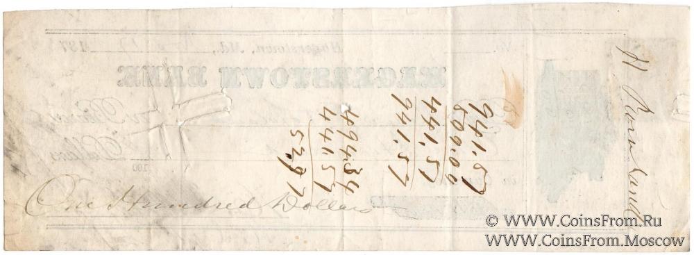 Банковский чек (погашен, оплачен). Перфорация. Штампы. Подписи. Хейгерстаун Банк (Hagerstown Bank).