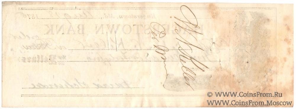 Банковский чек (погашен, оплачен). Без марки. Перфорация. Штампы. Подписи. Хейгерстаун Банк (Hagerstown Bank).