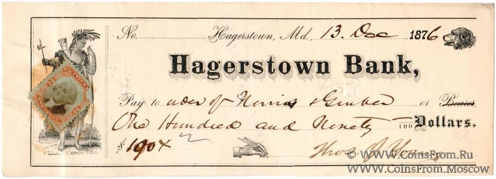 Банковский чек (погашен, оплачен). Перфорация. Штампы. Подписи. Хейгерстаун Банк (Hagerstown Bank).