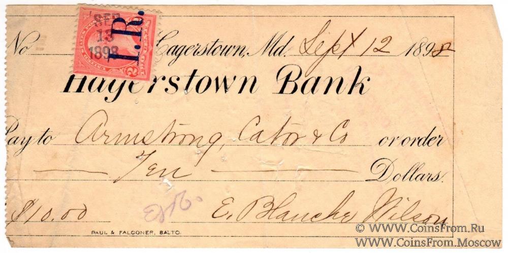 Банковский чек (погашен, оплачен). Перфорация. Штампы. Подписи. Хейгерстаун Банк (Hagerstown Bank). Типография: Paul & Falconer.