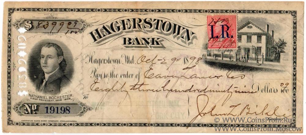 Банковский чек № 19198 (оплачен, погашен). Перфорация "$8399*09*". Чекодержатель: Национальный банк, Нью Йорк (National Bank, New York City). Хейгерстаун Банк (Hagerstown Bank). Типография: American Bank Note Company. Philadelphia. 1899.