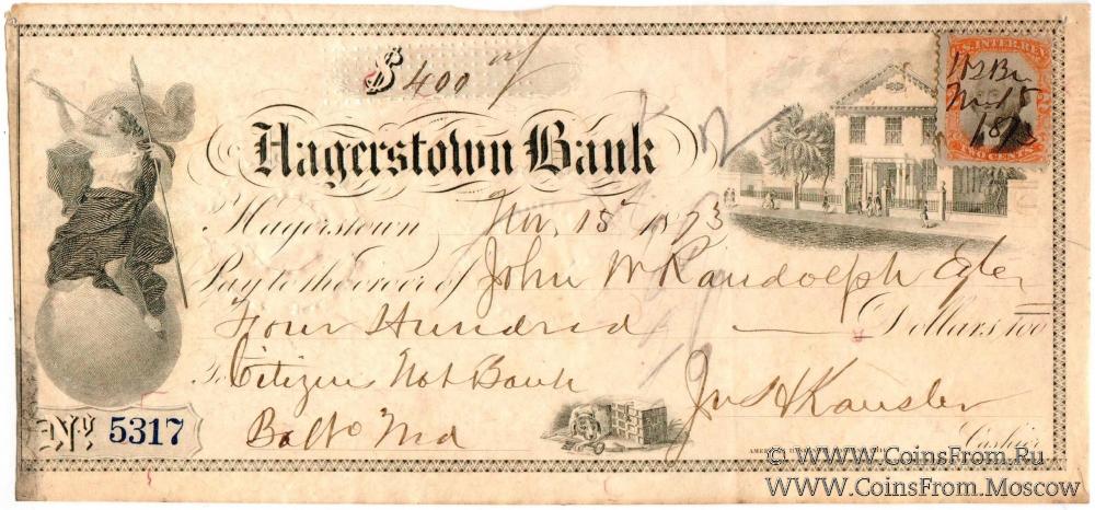Банковский чек № 5317 (погашен, оплачен). Хейгерстаун Банк (Hagerstown Bank). Типография: American Bank Note Company. Philadelphia.