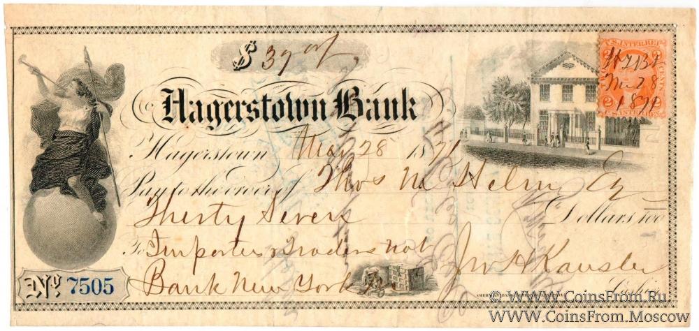 Банковский чек № 7505 (погашен, оплачен). Перфорация. Штампы. Подписи. Хейгерстаун Банк (Hagerstown Bank). Типография: American Bank Note Company. Philadelphia.